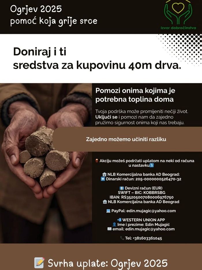 -Акција „Огрев - помоћ која грије срце“ трајаће до почетка октобра. Циљ је да се прикупи 3.400 евра како би се материјално „најрањивијим“ домаћинствима обезбедило и до кућне адресе дистрибуирало по два метра иструганих и исцепаних дрва– појашњава за „Варошке новине“ Един Мујагић, председник удружења „Извор доброчинства“.
