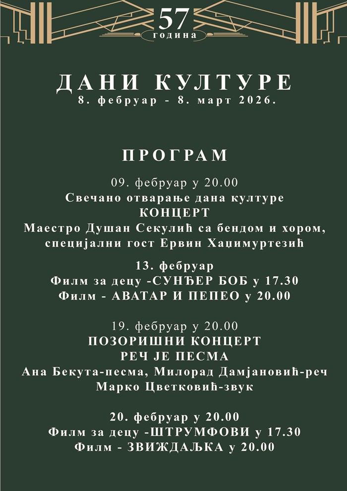 Концертом филмске музике „Филмска рапсодија“, у извођењу виртуоза на хармоници Душана Секулића, уз пратњу бенда и хора, и поетским наступом глумца Ервина Хаџимуртезића, у Новој Вароши су у понедељк 9. фебруара почели Дани културе. Трају до 8. марта, а на програму је десетак драмских, музичких и филмских садржаја.