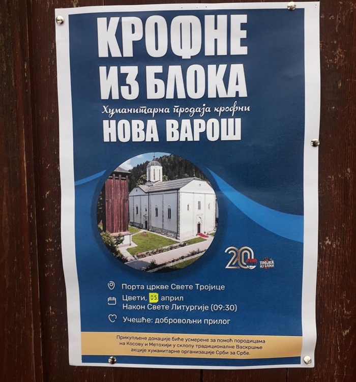 На празник Цвети, у недељу 5. априла, у порти цркве Свете Тројице у Новој Вароши биће организована хуманитарна продаја посних крофни на принципу добровољних прилога, а прикупљени новац биће усмерен за помоћ српским породицама на Косову и Метохији. Акција почиње у 9.30 сати, након Свете литургије, а организатор је Хуманитарна организација „Срби за Србе“ из Београда.