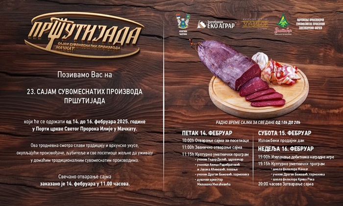 Пршутијада, 23. по реду, одржаће се од 14. до 16. фебруара у порти цркве Светог Пророка Илије у центру Мачката. На њој ће прозвођачи из златиборског краја излагати говеђу и свињску пршуту, стељу, сланину, кобасице и друге производе. Жири ће прогласити најбоље, а бројне награде очекују и посетиоце.