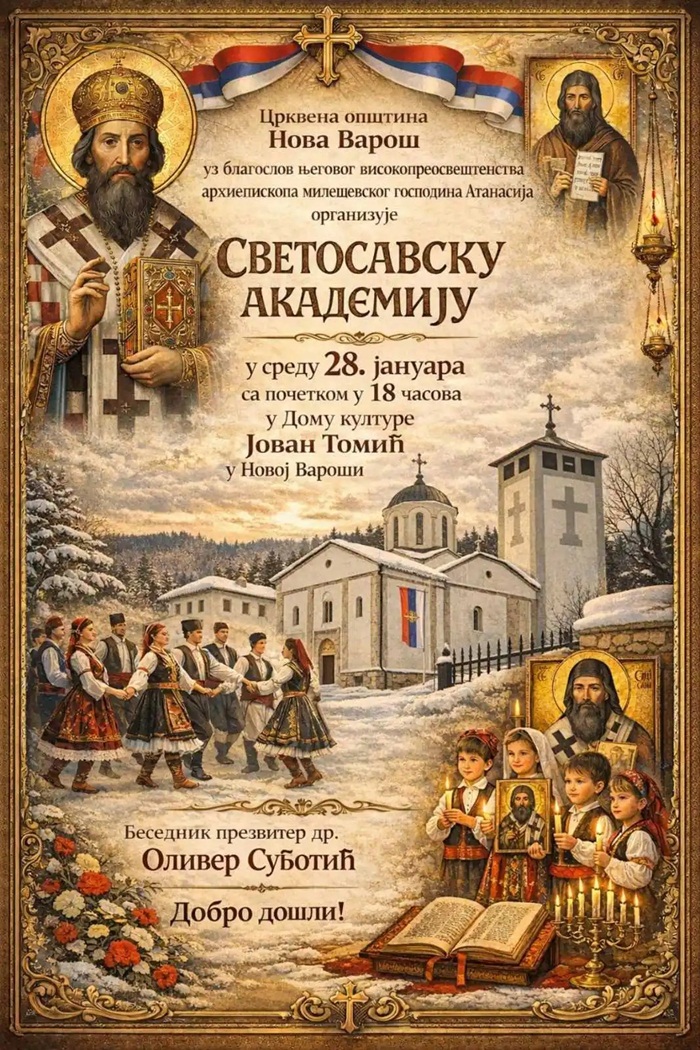 Светосавска академија у Новој Вароши одржаће се у среду 28. јануара у Дому културе „Јован Томић“ у 18 сати. Беседиће презвитер др Оливер Суботић, парох храма Светог Александра Невског у Београду, док ће у културно-уметничком програму наступити млади чувари традиције - ученици средње и основних школа, чланови фолклорног ансамбла и женска певачка група Дома културе, полазници Музичке школе и Предшколске установе...