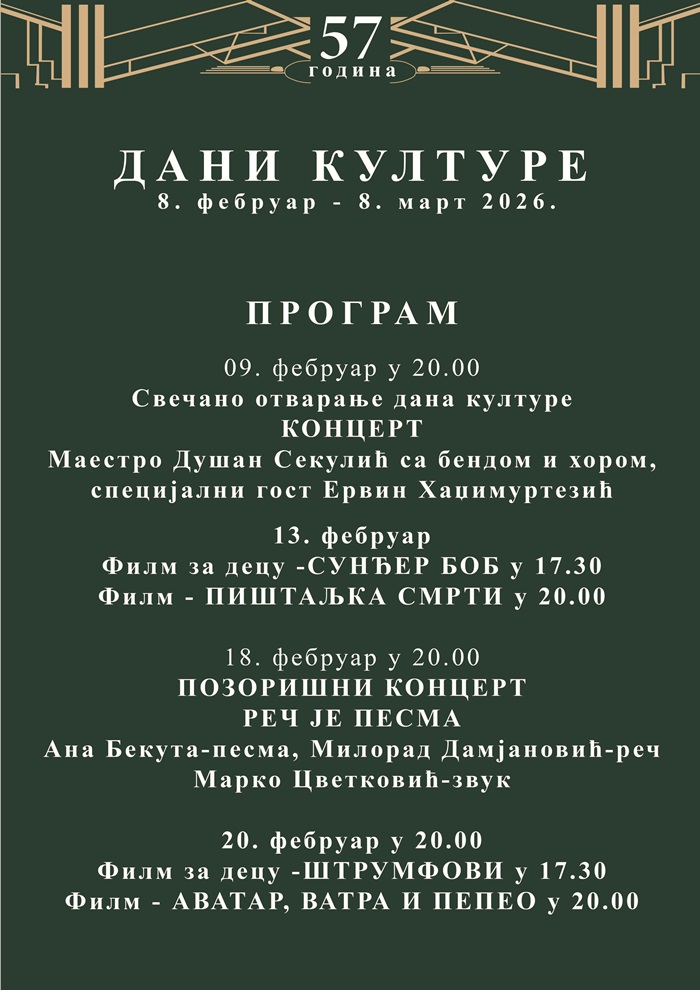 Концертом филмске музике „Филмска рапсодија“, у извођењу виртуоза на хармоници Душана Секулића, уз пратњу бенда и хора, и поетским наступом глумца Ервина Хаџимуртезића, у Новој Вароши су у понедељк 9. фебруара почели Дани културе. Трају до 8. марта, а на програму је десетак драмских, музичких и филмских садржаја.